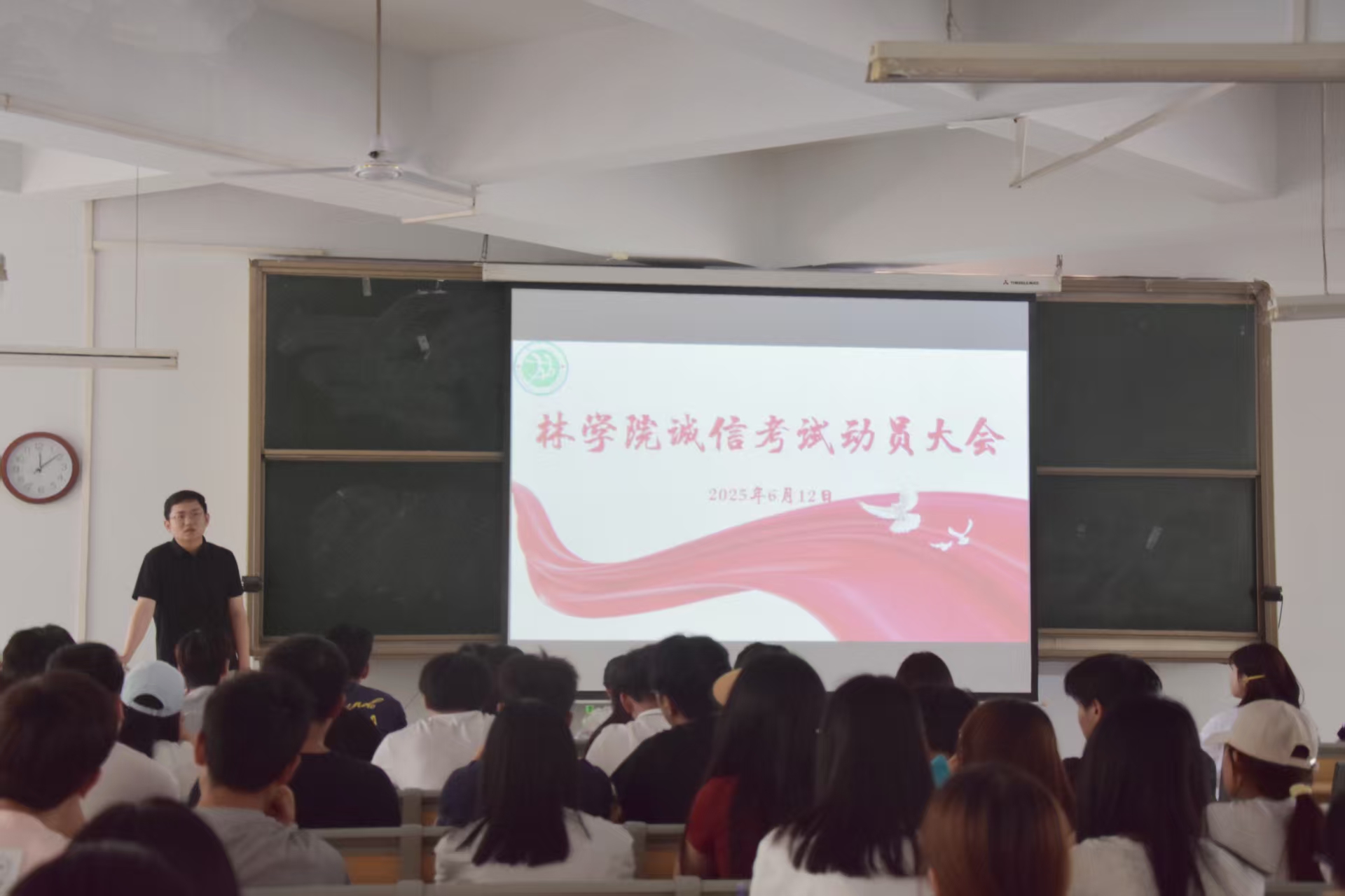 会上,张琛宣读《在线直播 关于进一步加强考试管理的若干意见》,严肃考风考纪,强调诚信考试的重要性,并以近期发生的真实案例提醒同学们严谨自律,诚信考试,杜绝一切作弊行为。接着,2024级环境工程二班赵壬浩作为学生代表宣读《在线直播 诚信考试倡议书》,号召同学们严格遵守考试规则,遵循考场纪律,诚实守信,认真备考。最后,全体学生代表起立宣誓,郑重承诺将以实际行动践行诚信准则,恪守考场纪律,自觉维护考场公平正义,展现出学院学子积极向上的精神风貌。