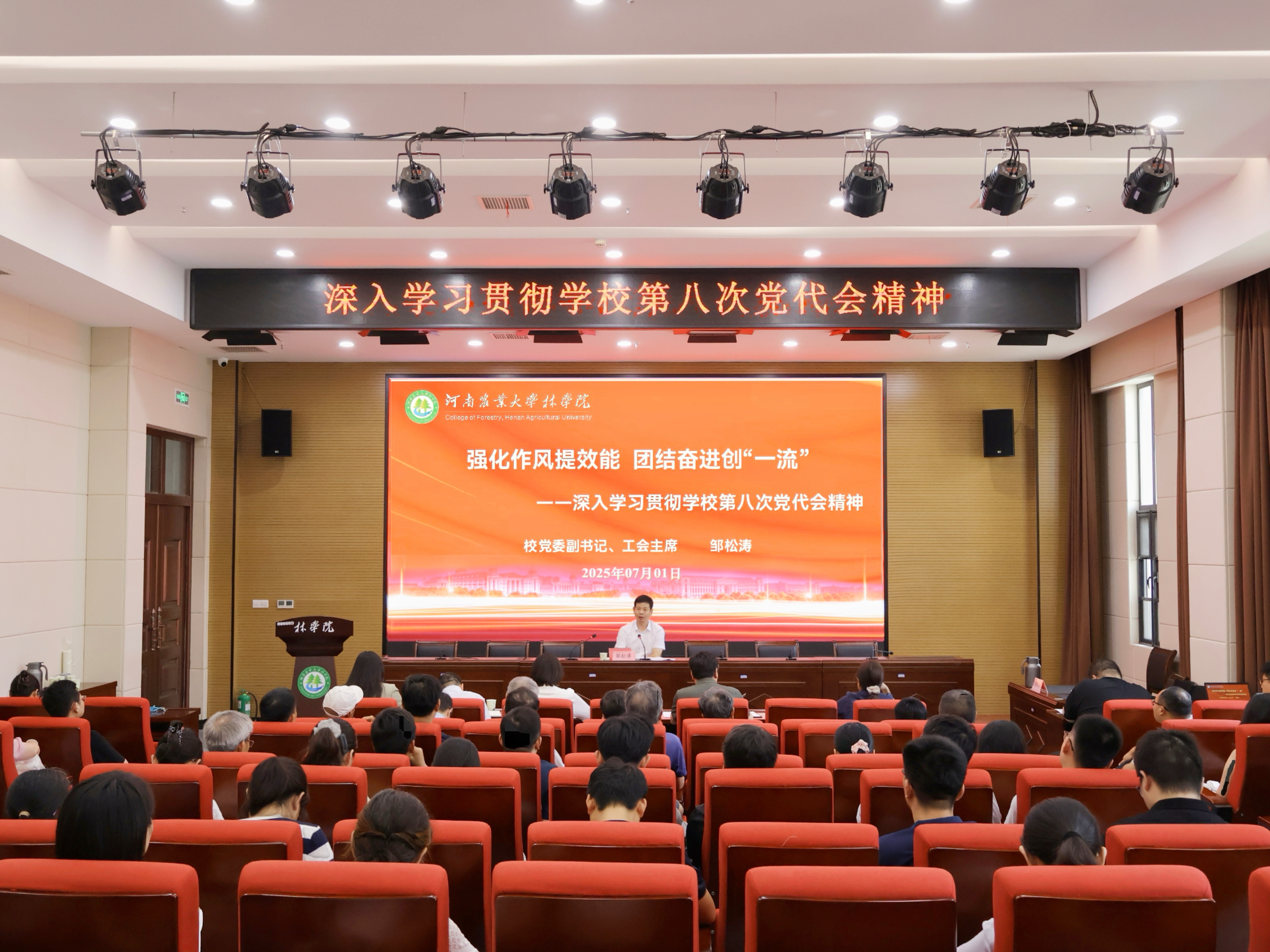 7月1日,校党委副书记、工会主席邹松涛走进在线直播 ,为全体教职工宣讲校第八次党代会精神。会议由在线直播 党委书记化青报主持。