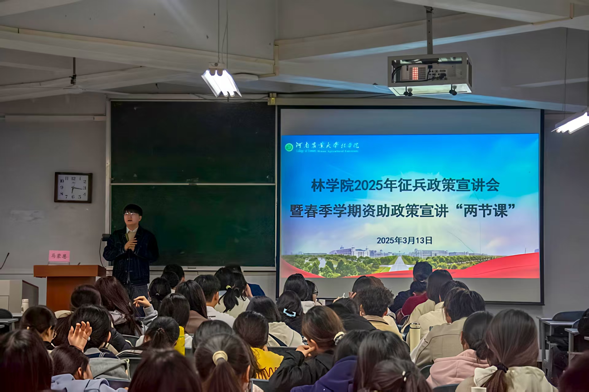 为加强国防安全教育,全面落实国家征兵举措。3月13日下午,在线直播 于桃李园学生公寓桃西楼405教室召开2025年征兵政策宣讲会暨春季学期资助政策“两节课”。本次宣讲会邀请校学生处武装部李传强老师担任主讲,院团委老师马蒙恩、张琛出席讲座、院“携笔从戎”征兵宣讲团成员及24级学生代表参加本次宣讲会。会议由马蒙恩主持。
