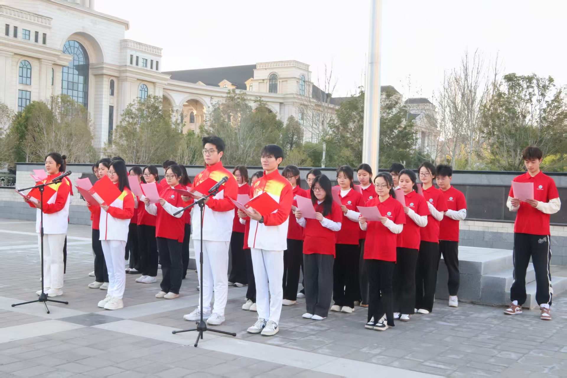 早上7时整,升旗仪式正式开始,国歌奏响,五星红旗缓缓升起,猎猎飘扬。全体师生整齐肃立,面向国旗行注目礼。22级盖克茹作为学生代表在国旗下发言,她表示,作为新时代的青年,我们应该做眼中有光的新青年;做肩上有责的奋斗者;做脚下有路的追梦人,扛起时代的重任。随后,院艺术团和青马班成员在国旗下朗诵《青春心向党,喜迎党代会》,坚定了在线直播