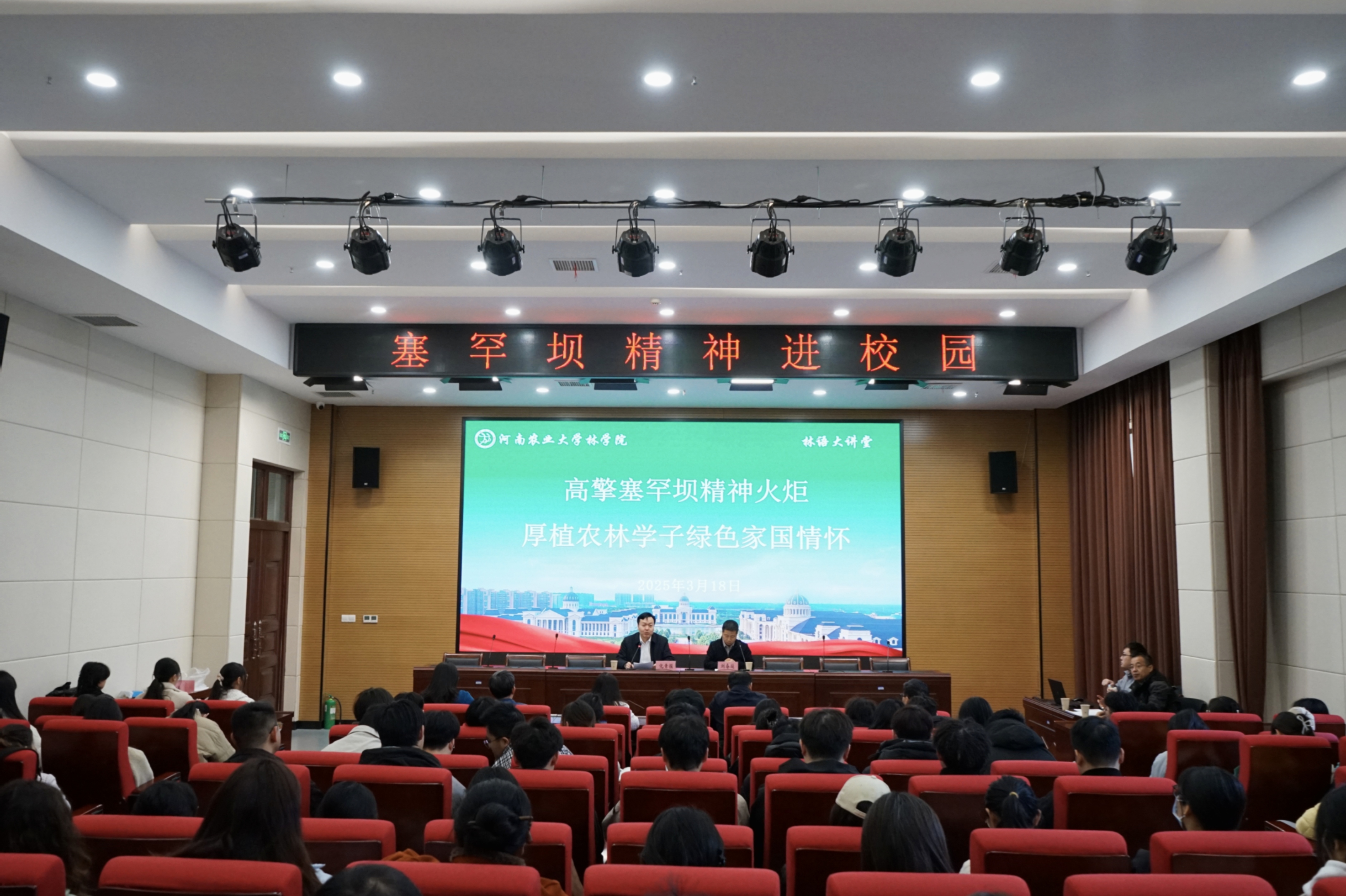刘春延以“高擎塞罕坝精神火炬,厚植农林学子绿色家国情怀”为主题,从塞罕坝精神是全党全社会的宝贵精神财富、塞罕坝精神是以林科学子为主将的塞罕坝人锻造出的强大精神力量、学习弘扬塞罕坝精神走好人生路三方面,回顾了塞罕坝人“牢记使命、艰苦创业、绿色发展”的奋斗历程,通过讲述三代人守林海、守护百万亩森林的感人故事,详细解读了塞罕坝精神的时代内涵,他强调,塞罕坝精神,是中国共产党人精神谱系的重要组成部分,是广大生态建设者在面对艰难困苦时所展现出的坚守与担当。他寄语农林学子,要深刻理解“绿水青山就是金山银山”的科学论断,将个人理想融入国家生态文明建设大局。