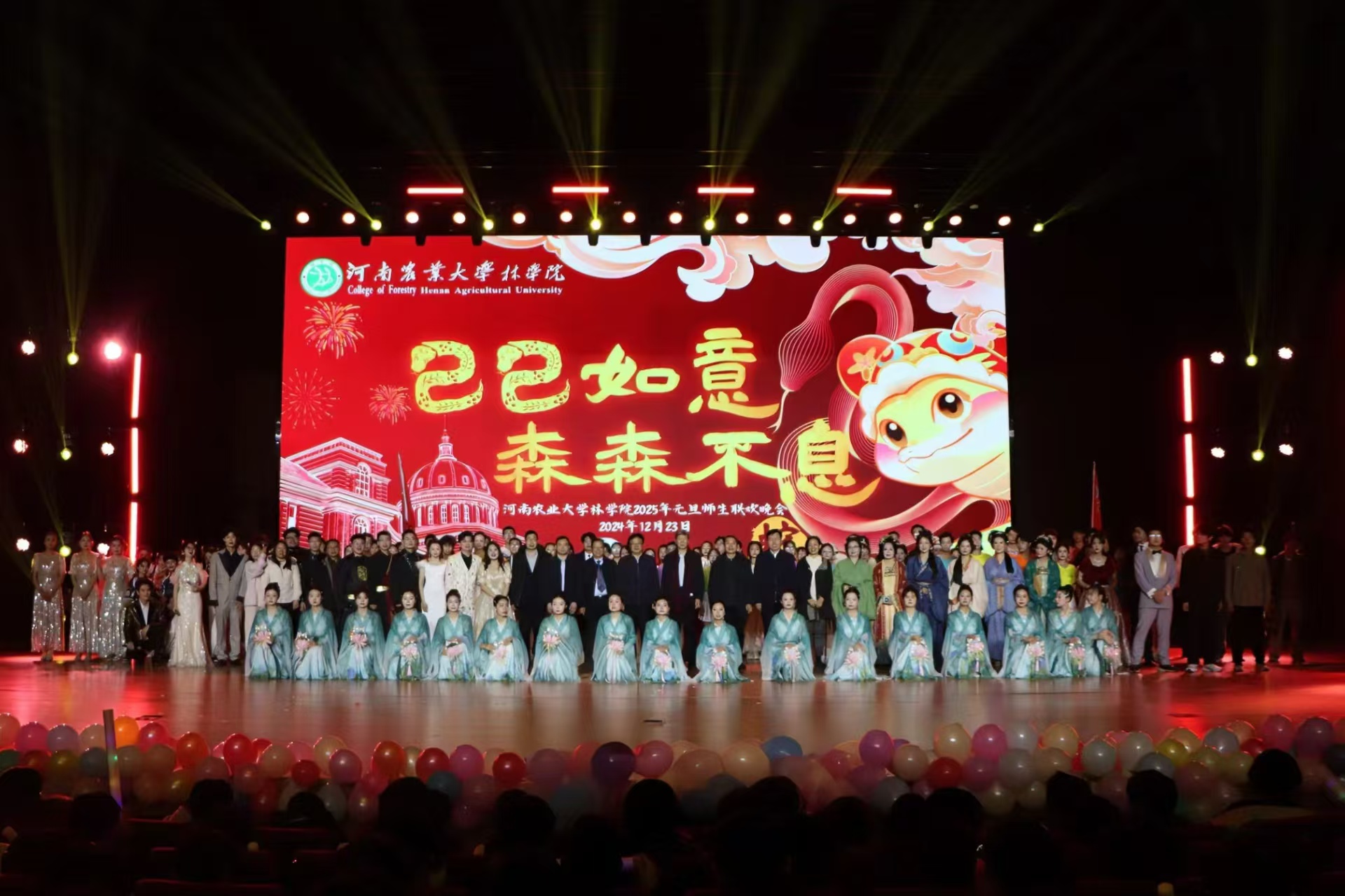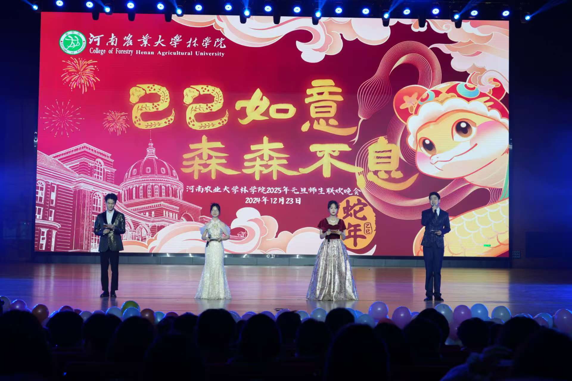 2025年元旦师生联欢晚会于龙子湖校区英林讲堂隆重举行。副校长杨喜田、校党委宣传部部长邓振营、校党委学工部部长徐峰、校招生就业办公室主任张红阳、校党委保卫部部长刘全军、校团委书记贾云飞、校工会副主席董晓莉、校党委办公室副主任张保磊、校党委统战部副部长蒋春红、校党委学工部副部长王玲、在线直播