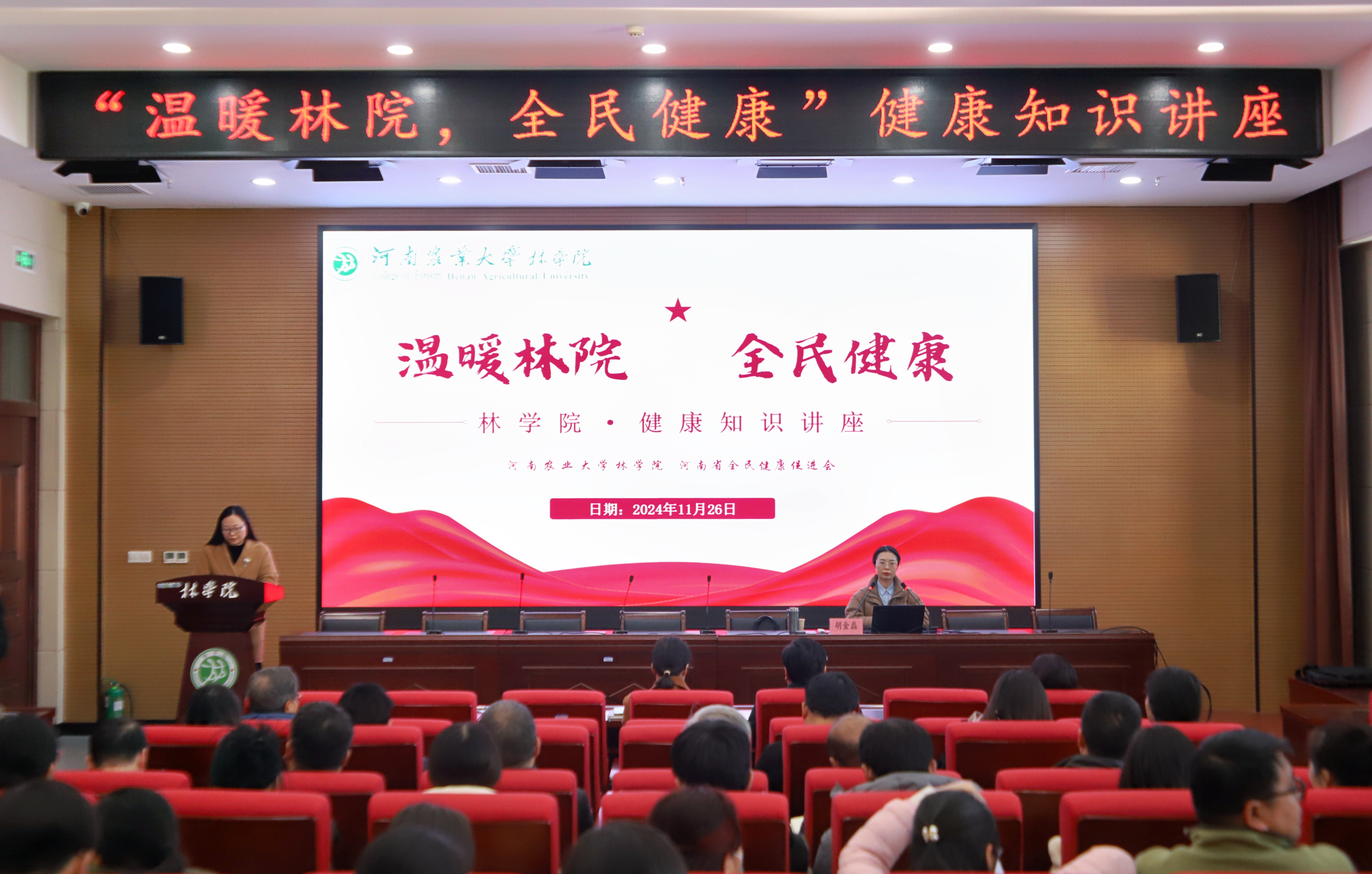 11月26日,在线直播 于力行楼南428报告厅举办“温暖林院,全民健康”健康知识讲座。本次讲座由河南省全民健康促进会健康教育委员会成员、河南省安全健康教育中心宣教办主任胡金磊担任主讲嘉宾。院党委书记化青报、院党委副书记王娟、副院长张学芳、副院长李喜梅出席本次讲座。在线直播 全体教职工及学生代表参加本次讲座。