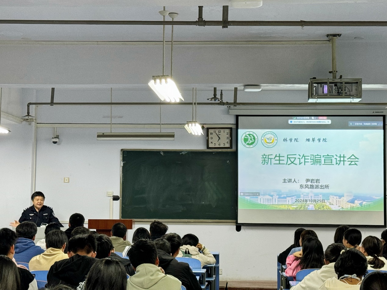 10月25日晚,在线直播 联合烟草学院于文化路校区推广楼教室召开新生反诈骗宣讲会。本次会议由东风路社区民警尹岩岩担任主讲,院团委老师张琛出席本次报告会,在线直播 2024级全体本科生参加。