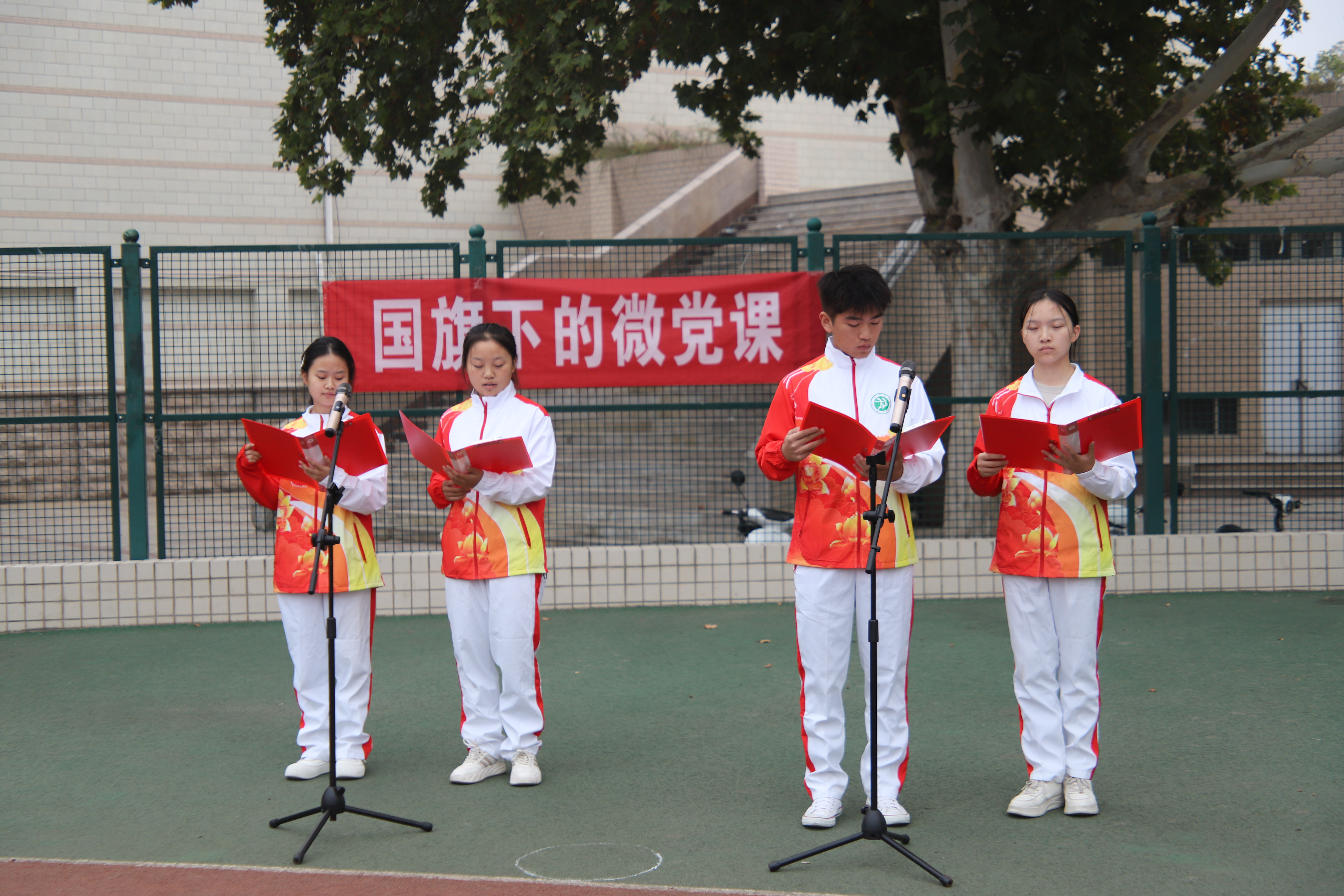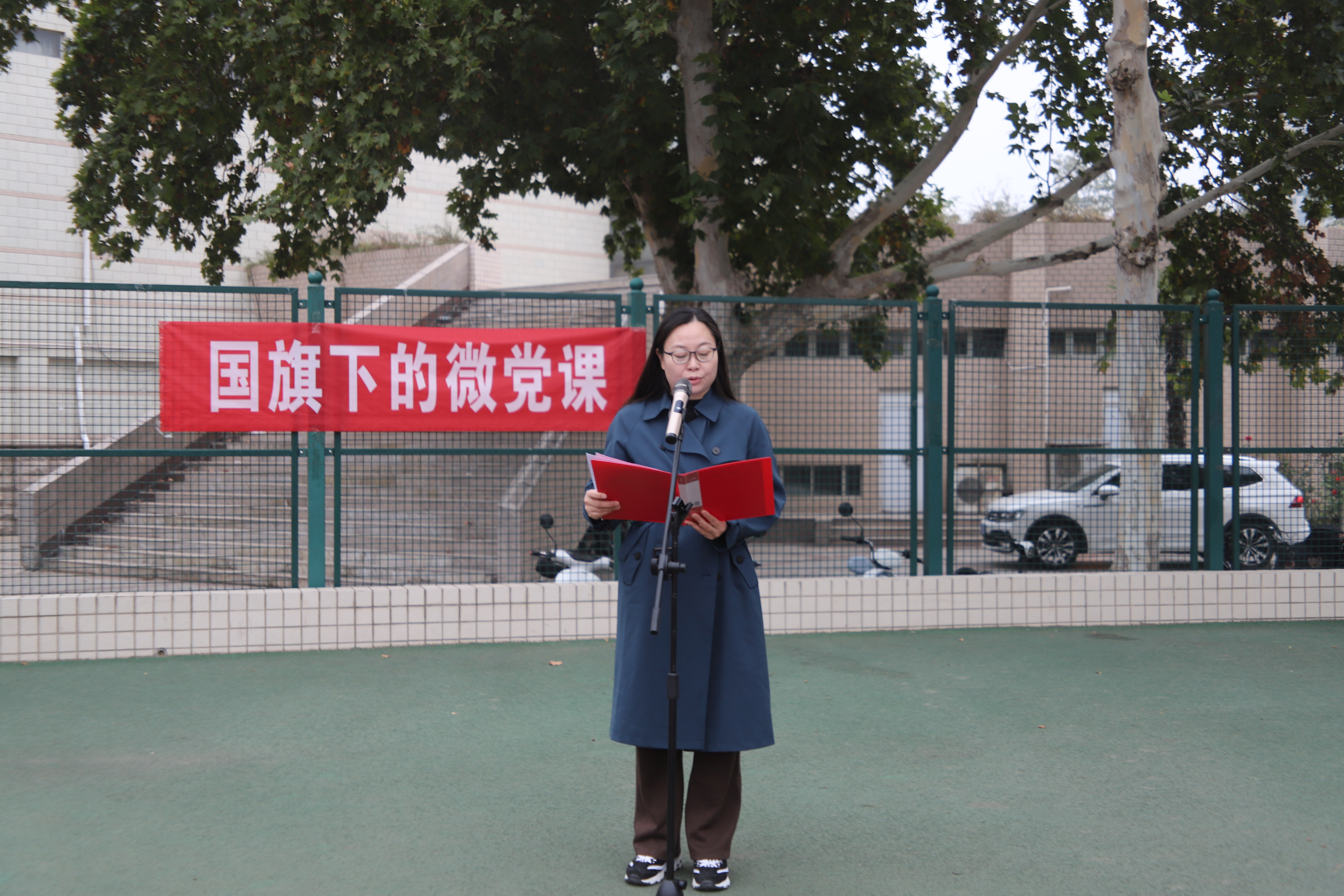 10月28日,在线直播 于文化路校区田径场举行“喜迎党代会,国旗映新章”升国旗仪式。院党委副书记王娟,院团委书记田原、院团委老师、教师代表等出席活动。升旗仪式由田原主持。
