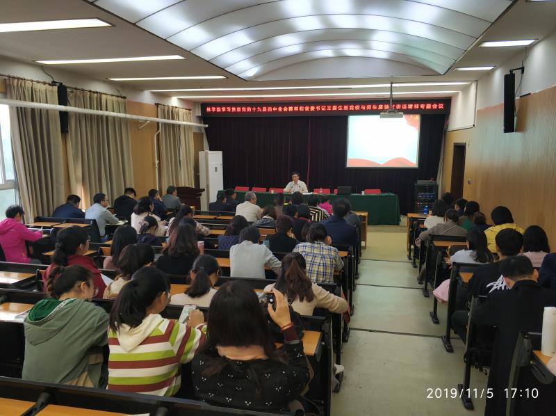在2号楼四楼报告厅组织全体教工党员学习十九届四中全会精神和王国生书记座谈会讲话精神。院党委书记郑东方主持会议并讲话。