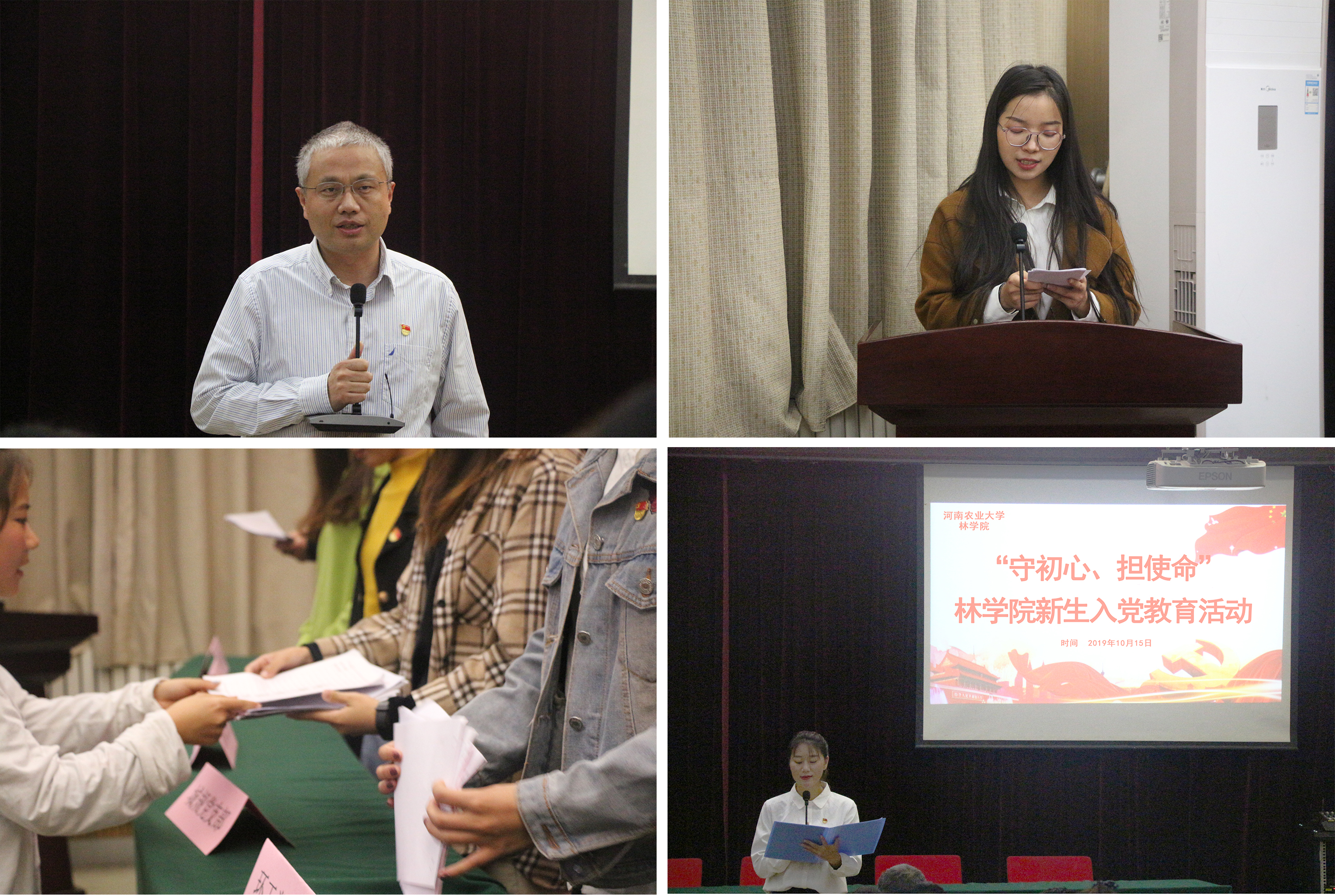 为推进主题教育深入开展,进一步强化青年学子的理想信念,坚定入党初心,激发爱国爱党热情,10月15日晚,在线直播 在2号楼4楼报告厅举行“守初心,担使命”新生入党教育活动。林学系教工党员李继东、院团委老师刘洋、各学生党支部书记、百余名新生代表参加活动。