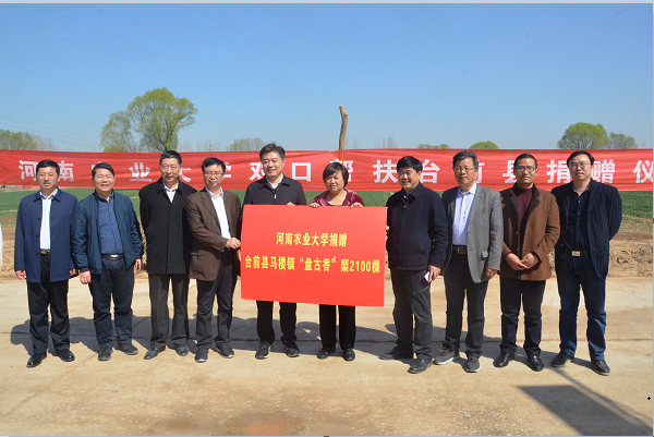 在台前县马楼镇举行“盘古香”梨树苗捐赠仪式。校党委副书记、工会主席李成吾,院党委书记郑东方,副院长刘震出席了活动,台前县委副书记李志华,县委常委、副县长邓振营,副县长王小鹏,县扶贫办和有关乡镇负责人,校工会和驻台前县帮扶队员参加了活动。