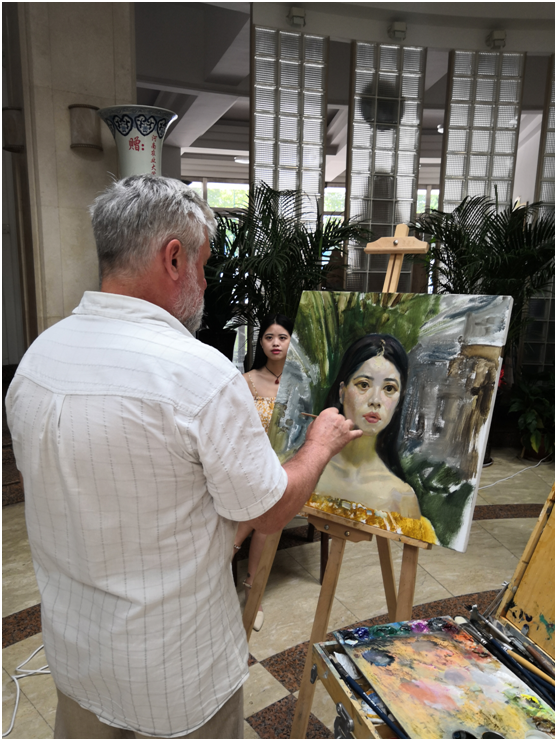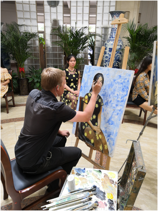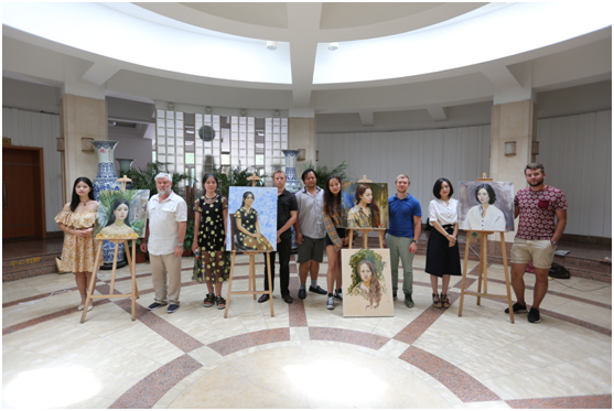 9月3日上午,俄罗斯功勋艺术家亚历山大·伊万诺夫带领列宾美院三名学生在三百人报告厅天光休息区为在线直播