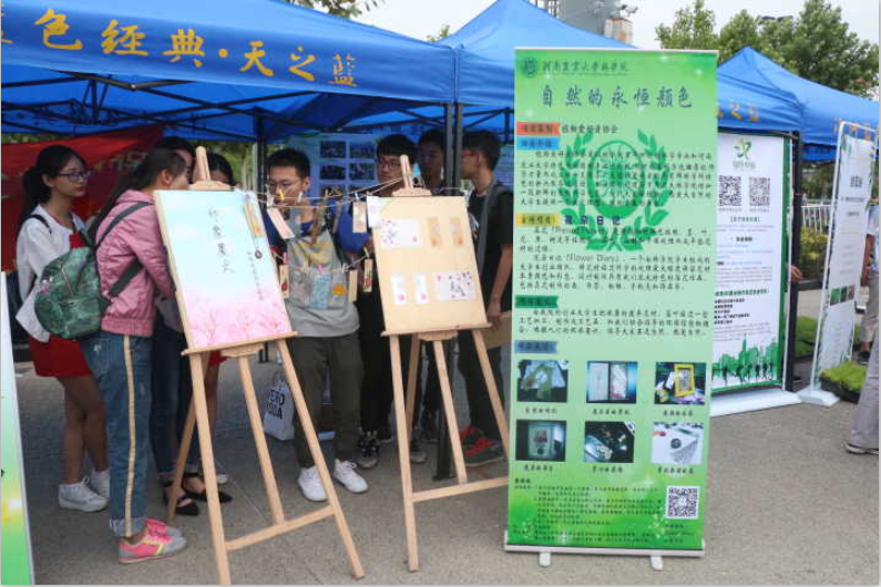 植物爱好者保护协会和Flower Diary花朵日记压花创业团队精心布置展览作品,举办了猜树谜有奖回答、压花作品展等活动,创业团队学生将落叶、落花经过压花工艺加工,制作成精美的书签、相框、手机壳等工艺品,唤起人们的环保意识,引导市民亲近自然、热爱自然,吸引了众多市民驻足观赏。随后,同学们还积极参与了环湖骑行、沿CBD会展中心环跑等活动,充分展现了“提倡绿色低碳出行,紧跟绿色环保节奏”的活动精神。