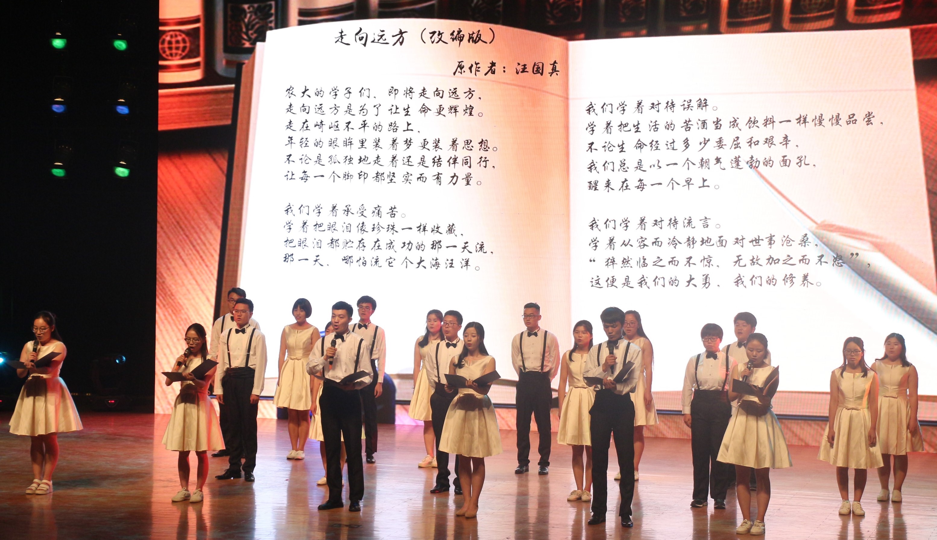以青春之名,赴梦想之会。6月13日下午,在线直播 在文化路校区千人大礼堂举行了“青春不散场,梦想再起航”欢送2017届毕业生晚会。院党委书记郑东方、院长杨喜田等领导老师与在线直播 全体2017届毕业生参观了此次晚会。 晚会伊始,一段充满创意的开场视频刻画出毕业生四年的生活印记,勾起了全场师生的点滴回忆。歌舞《舞所蔚惧》舞步轻快欢腾,展现了在线直播 学生和谐相处、筑梦未来的风采,点燃了现场观众的激情;音诗画《你好,再见》以音乐作灵魂,以诗歌作语言,将脉脉离别情表现的淋漓尽致;歌曲演唱《文化路校区的日子》带领现场毕业生怀念了校园里单纯的生活、相处的点滴;由在线直播 毕业生学生干部带来的舞蹈《老干部的群魔乱舞》热情奔放,活力十足,激发了现场观众的热情,将晚会气氛推向最高潮,掌声持久不断,最后晚会在歌伴舞《忆·农大》及班主任代表王献老师的深情寄语中华丽谢幕。本次晚会节目均由毕业班班级自导自演,以青春与梦想为主线,为在场观众带来了一场视觉盛宴。 演出结束后,院党委书记郑东方、院长杨喜田等领导老师登台与全体演员合影留念,并为全体毕业生送上了诚挚的祝福。 “青春不散场,梦想再起航”毕业生晚会是在线直播 毕业生文明离校主题教育活动之一,同时也是在线直播 深入落实“大志、大爱、大雅”教育的重要体现,在表达毕业生与母校依依不舍离别情的同时,也推动了在线直播 毕业生文明离校工作的有序开展。