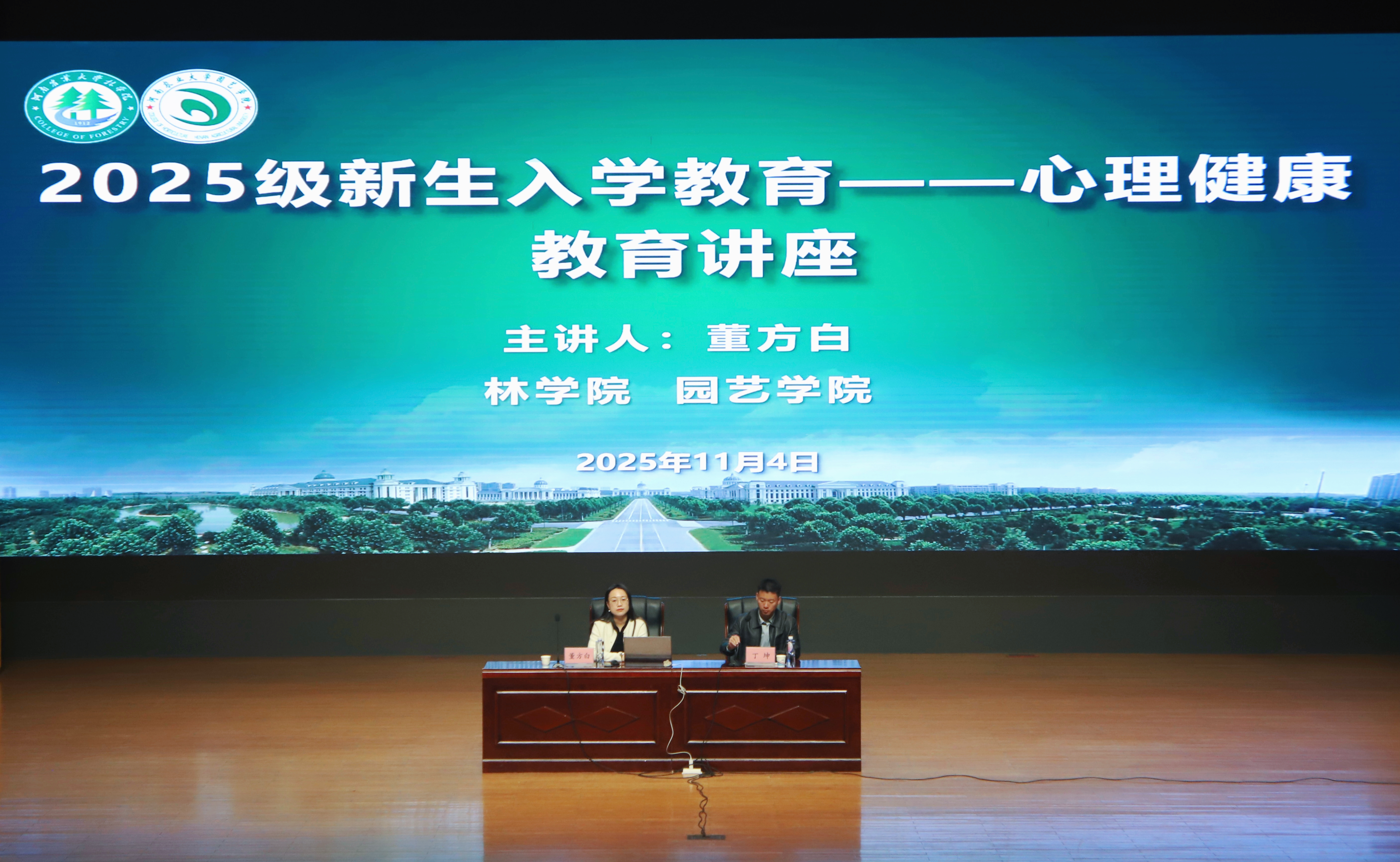 与园艺学院于文化路校区大礼堂联合举办2025级新生心理健康教育讲座。校心理健康教育中心主任董方白老师担任主讲嘉宾,两院2025级全体新生参加。讲座由园艺学院2025级辅导员丁坤主持。