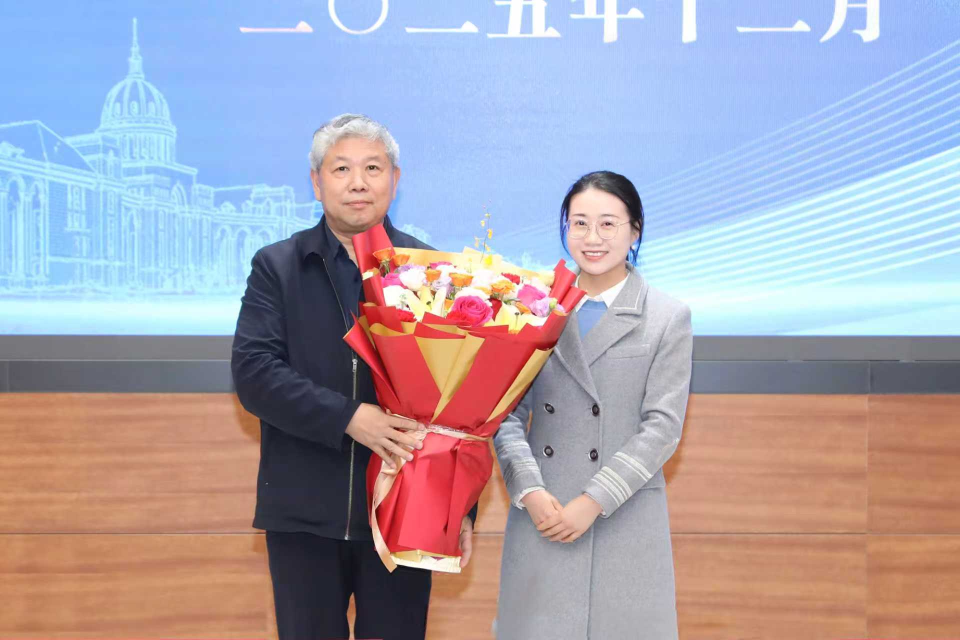 青年教师陈圆圆代表与会人员向范国强院士献花祝贺。范国强对学校长期以来的关心培养表示感谢,并系统汇报了林学学科的发展基础、优势特色及下一步建设打算。