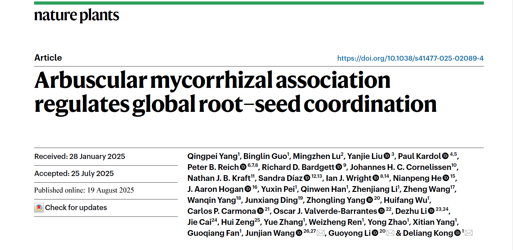 孔德良教授团队在国际植物学顶级期刊《Nature Plants》上发表题为《Arbuscular mycorrhizal association regulates global root-seed coordination》的研究论文。本研究首次报道了全球尺度上植物根系与种子性状的协同变化规律,并揭示了菌根真菌通过磷获取和致病菌防御功能在根-种子协同关系中的关键作用。