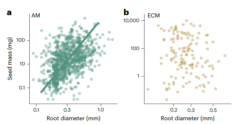 图1. 全球尺度丛枝菌根(AM)植物(a)和外生菌根(ECM)植物(b)吸收根直径与其种子质量的关系