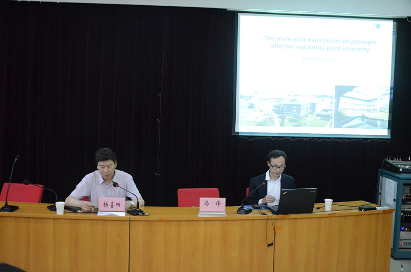师生作了题目为《病原细菌效应蛋白调节植物天然免疫的分子机理》的学术讲座,报告会由院长杨喜田教授主持。冯峰博士的报告内容主要围绕植物和病原微生物、共生真菌、病原细菌效应蛋白调节、植物天然免疫分子四个部分。